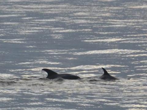 Report from Hafsúlan: No wind and calm sea were greeting us today. Perfect spotting conditions were offered. The sky was cloud covered but sometimes there was some golden light for a short time reflecting on the calm water. Short after leaving the harbour we already could enjoy our first sighting. Approximately 6 Harbour Porpoises have been calmly swimming around, surfacing several times in our vicinity so that with the time hopefully everybody was able to make out their small triangular dorsal fins and parts of their bodies. We continued further out to Faxaflói and we saw some White-Beaked Dolphins in the distance. As we came closer we could observe different behaviours from breaching to leaping, surfacing fast and some direction changes including approximation from side of the dolphins. Some were swimming synchronously in a tighter line formation but the pod was very dispersed. There were sometimes visible 180° towards the front of the boat. All in all there were between 20-30 individuals visible, some of them younger ones. After we were able to observe them very well closer and also further away thanks to the calm sea conditions we got a very good impression of dolphins in the wild. As we went from the smallest cetaceans to the bigger ones we were looking for even larger sizes and so we did find our first Minke Whale surrounded by a lot of different bird species. We could identify this one as "Aura". He came up several times and we had good looks but then he went for a longer dive and so we were slowly heading landwards. In front of us appeared more White-Beaked Dolphins this time a smaller pod (4-5) maybe part of the once we saw before. While we were watching these dolphins heading out into the open ocean there was another Minke surfacing in the distance towards the harbour. So we decided to sail towards the whale and as we came closer we realized that there were even two Minkes close by and a third further away. The two closer by were "Tap" and "Peanut" which we also recognized thanks to their unique dorsal fins. We saw them from different angles even coming towards us and for a glimpse the white pectoral patch was visibly shining through the water. Having so much to look at time flew by very quickly and we had seen 3 species and with two of them we could spend quite a nice time. What a nice day!