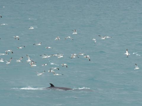 Report from Hafsúlan: With clouds all around we were expecting rain at any moment but, luckily, we stayed dry the entire trip and the sea conditions were fairly smooth, only a few white-caps here and there. We first sailed to the entrance of the Hvalfjödur, where dolphins had been seen earlier, but had no luck in finding them. While searching for them though, we spotted 2 minke whales feeding underneath small flocks of birds. They kept on feeding even as we approached and moved sometimes fast, sometimes slow and very randomly, which is normal when they are chasing fish. After an hour with these minke whales, we left the area only to sight another minke whale, which came very close to us, and then, going back along the Hvalfjödur again, finally find the pod of 5 white-beaked dolphins we looked for earlier! They were with a calf, seemingly teaching it how to behave around boats, as they came to bow ride. Suddenly, after 10 minutes they went for a dive and dissapeared. Wonderful that they have this simple choice as soon as they do not want to interact anymore. Thus, we sailed on and back to the harbour.