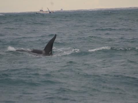 Report from Hafsúlan: we had some interesting wildlife sightings already in the harbour whilst waiting to go out. A falcon sat on one of the rocks observing us briefly and a common seal popped its head up! Out we went again but the humpbacks from the morning had gone off or at least we could not see them or their blows. We decided to try our luck more south and sailed first out to the west and then south down towards the most south-western point of Reykjanes Peninsula, called Reykjanestá. All along we saw fishing boats either leaving or returning to the capelin fishing grounds. Captain Gulli contacted M/S Jón Kjartansson and they said that they were seeing some whale blows around them. Then they were about four miles away. We were assessing the option of sailing out to them when some dorsal fins came towards us swimming at great speed; those were some 3-4 white-beaked dolphins. However, those guys had something far more important on their agenda than to entertain us as we only saw them 3-4 times and barely at that. We decided not to go offshore towards Jón Kjartansson but to search closer to the coast to get more shelter from the wind. This turned out to be a wise decision. As we got closer to Reykjanestá (the most south-western point) a dorsal fin larger than those of the dolphins caught our attention in some distance. This could be one thing and one thing only: Orcas! Yay! It was about 10 Orcas, quite dispersed and most likely the same group as was seen west of Grindavik yesterday, just on the other side of Reykjanestá! Perhaps as many as half of them were adult males. What an incredible finding this was. True, we didn't see any humpbacks, but when we explained to the passengers what a rare sighting Orcas are and how lucky they were, there seemed to be smile on every face. But even if they'd be a daily sighting, it would be impossible to get enough of the largest of the dolphins. Simply impossible.