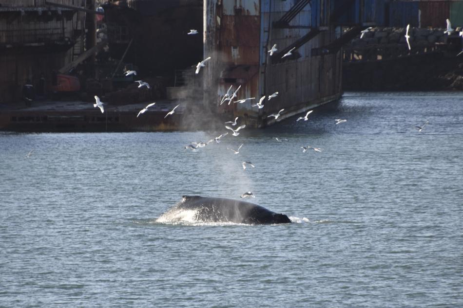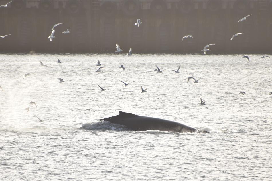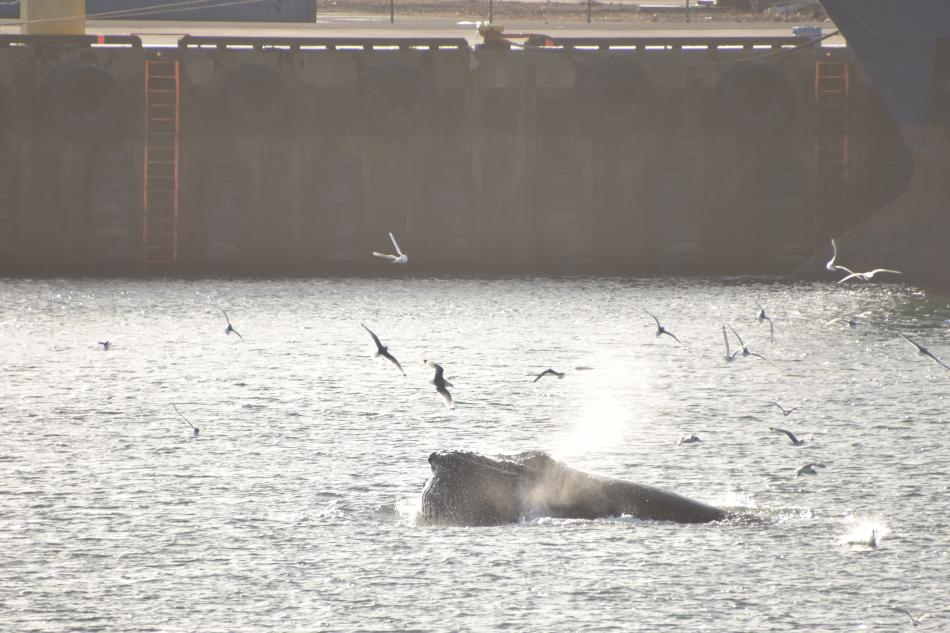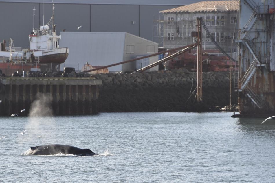 Report from Eldey: Today we had four seasons in one day! We sailed out in windy conditions and I could see a huge grey cloud infront of us. As we approached it, it turned out to be a hail-cloud not a rain cloud! It did not last very long and we quickly made it out the other side and were now greeted by blue skies. After about an hour of sailing we reached Hafnarfjordur and we saw multiple blows in the distance. There were about 4 humpback whales in the area, 2 of which we saw very closely, and one of which was lunge feeding quite a bit! We stayed a bit but eventually headed back when time ran out. On the return journey, we sailed into more snow and then arrived at a sunny Reykjavik.