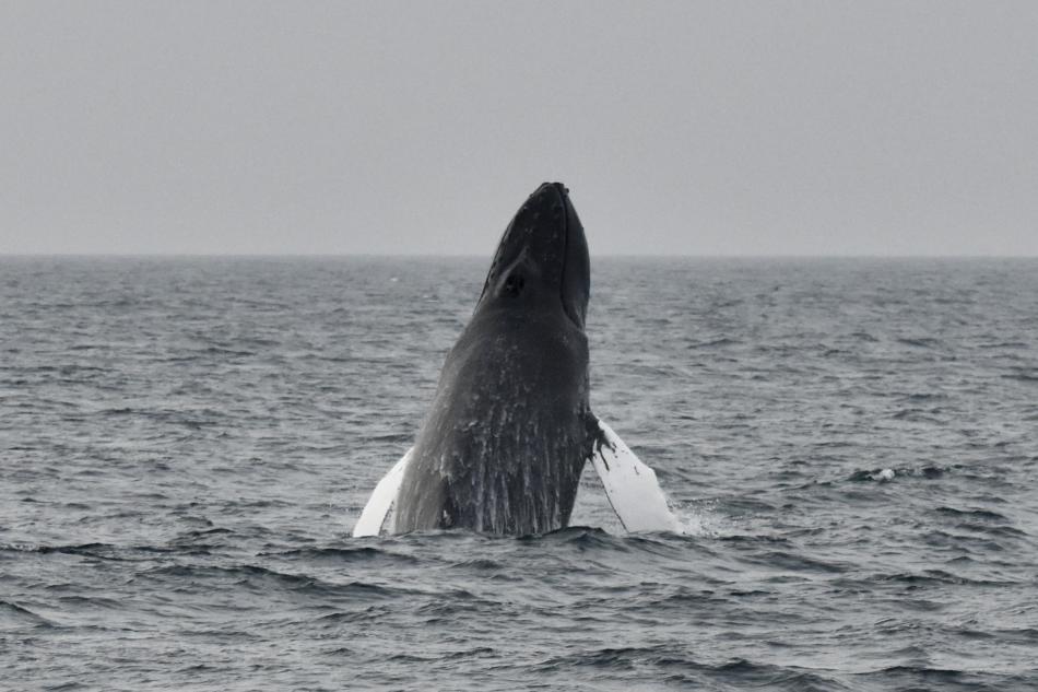 Report from Elding: The everlasting volcanic haze was still overhead but the seas conditions were still very calm, with only small waves forming. After searching around we found a great area with 4 humpback whales, the first one we encountered gave us an incredible show with breaches, pecslaps and pecuncle throws. We stayed with this animal until the exhaustion took the best of him and he finally settled for long slow dives. We then travelled between the other 3 humpbacks for the remainder of the tour, as we got to witness 2 of them breach multiple times in the distance aswell. Inbetween we also spotted a pod of around 6 white-beaked dolphins jumping in the distance, and out of nowhere they showed up right alongside us, clearly checking out our boat! To top it all of, we also spotted a minke whale right next to a humpback as they were feeding on the same school of fish. What a night!
