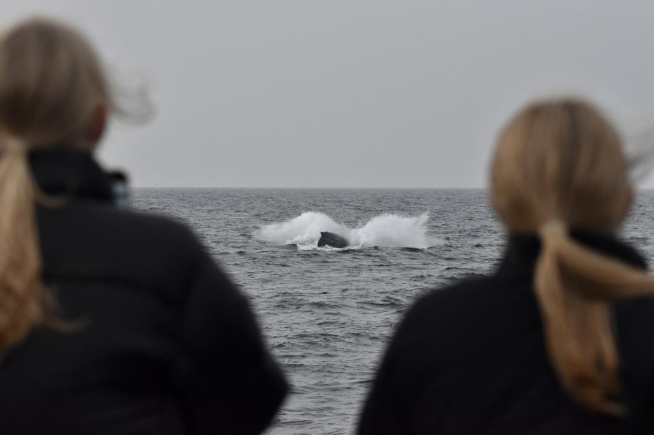 Report from Hafsulan: Although visibility remains limited these days, due to the amount of fog covering Faxaflói Bay, today we definitely saw an improvement, with slightly better visibility and calm seas. This allowed us to search for the whales more easily and, soon enough, we had our first sighting of 2 minke whales. We managed to observe them multiple times, while they surfaced for air, before diving back into the depths of the ocean. After leaving these whales, we were rapidly surprised by a new sighting. A group of 8 white-beaked dolphins found us (instead of us finding them), and rapidly approached to investigate our ship. After interacting with these social animals for a while, they eventually lost interest and left the area, while we continued our search. The fun thing is that, some five minutes later, we sighted a 3rd species, as a pair of harbour porpoises passed by, fast-swimming ahead of our ship. These are easily the shiest species on our tours, and just as quickly as they appeared, they disappeared again, allowing only a part of our passengers to spot them. Nevertheless, it didn´t take long for us to see our 4th and final species, a lonely, but large humpback whale hunting in the company of hundreds of seabirds (kittiwakes, artic terns, northern fulmars and black-backed gulls). This humpback was lunge-feeding, bringing the fish up, before swallowing them at the surface, giving us a great view of its giant head. After this spectacular show, we headed back to Reykjavík, having seen all the 4 species we tend to find in our tour.