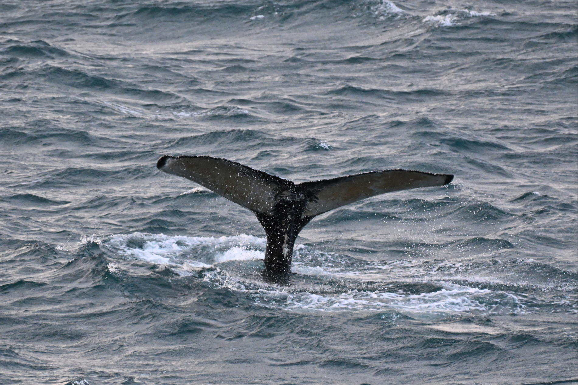 Report from Eldey: We went face first into a strong wind and some hail as we sailed out, but luckily the sea was still mostly flat as we searched between the islands for whales. It took a bit of looking around but then we found our all time favorite duo of humpback whales Banana and Split again. At almost the same time, the sun started to peak through the clouds while the precipitation settled and a rainbow lit up the sky! With whales one side and a rainbow the other, we cruised around, following them on their journey. We saw many great fluke dives and a few surprise surfaces really close! After having soaked all this in, we went to explore the area a bit more and one last quick stop with these whales later we decided to return to the harbour. This concluded another great day at sea!