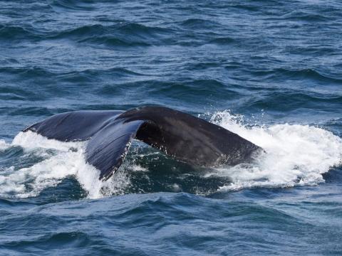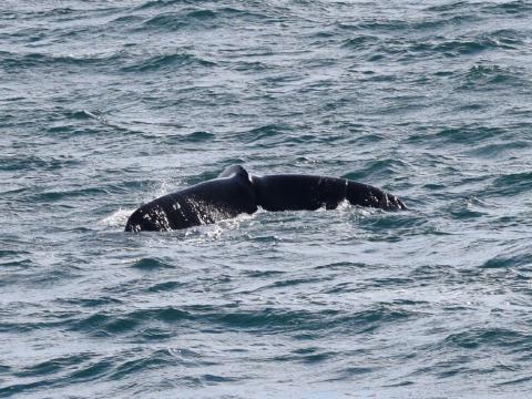 Report from Hafsúlan: For the beginning of our tour, the wind seemed to have calmed down even more, the sun was still shining as brightly as it had been during our first tour and clouds still were only further around the bay. Our first highlight were the numerous puffins we could see all around, some even feeding on sandeels. We encountered our first whale about 50 minutes away from the harbour, a feeding minke whale that surfaced for us 6 times, 3 of these very close to our left side. It was quite hard to follow, but everyone managed to get a good look at it and, only 2 minutes after deciding to leave this whale, we found ourselves a humpback whale. It was the same as in the morning tour at 9 am, which we could tell by the pattern on it's fluke. It was very curious at first and then wowed all of us with some peduncle slabs - throwing it's tail onto the water. A very exciting tour for all of us.
