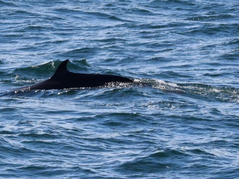 Report from Hafsúlan: This was certainly a great day to be out on the water. Sunshine, light winds and clear skies. In addition, there was just a lot of animal life all around us. There were hundreds of Puffins today in addition to many large flocks of birds. Our first encounter was with 4-5 white-beaked dolphins! They were traveling rather quickly so we could keep up with them for a good 10 minutes until we decided to leave them be and keep heading further out to where we were seeing even more birds. Underneath 2 flocks of birds, we saw 2 minke whales feeding. One of them surfaced less than 150 meters away from us while feeding and then a third minke whale showed up. We were all enjoying this feeding action but, since we spotted a larger blow, indicative of another species, we went to check it out. Sure enough, we got to watch a humpback whale that was super interested in the boat, swimming around us and surfacing no more than 30 meters away. We could even see it's white pectoral fins under the water, hear it exhale and watch it's beautiful dive pattern, showing us it's tail.