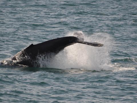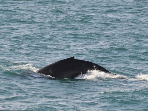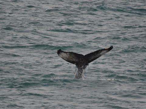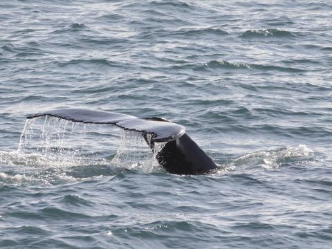 Report from Elding. A beautiful day on a whale watching tour, sun was out but the sea was choppy and the wind quite chilly that a few of our passengers made use of the free overalls (floatation suits) we offer onboard. After about 40 minutes of sailing we got a call from another boat about a humpback whale. Taking us 20 minutes to reach the area, we waited for the other whale watching boats until they were finished as they had less time than us and its not respectful to have too many boats around the whale at once. Whilst we were waiting we saw another humpback whale in the distance in front of us. We were slowly traveling when it surfaced just metes from the boat. We didn´t have to leave this whale as it just did what humpback whales do best, feed, travel, sleep. At one point I looked down and saw the head rising above the depths. It was however, never showing it´s fluke as it went down and when everyone had given up and lowered their camera´s, a high incredible tail (fluke) as it dove.  Keeping this whale company for a while was a pair of white-beaked dolphins. You just needed to watch the birds and dolphins to know where the whale will surface next. We gave the humpback a round of applause before leaving for home.