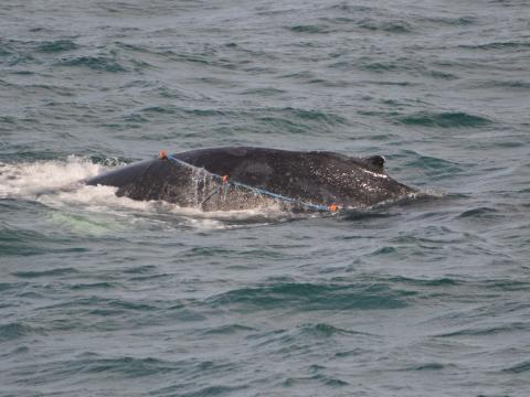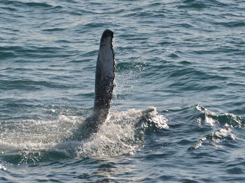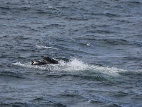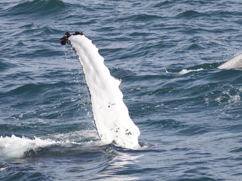 Report from Hafsúlan: In the afternoon we decided to go straight to the location where we spotted an humpback whale last. While traveling out of the bay we had a quick encounter with a minke whale swimming towards Reykjavik as well as jumping dolphins a bit further away. We kept going anyway, and as it turned out, it was a good decision as we didn't just find one humpback whale, we found two. The first one was an animal that was tangled up in a fishing net. As a coast guard boat and some of our rip boats approached the humpback whale to try and cut it free, we left the area to spot other individuals to give them space and reduce the stress- level of the  animal. During the rest of our tour we enjoyed watching the second humpback whale as it was showing very interesting behaviour like tail slapping. This animals was also accompanied by a pod of dolphins jumping over it and swimming under it, very amazing to watch. We even managed to spot several more animal on the way back to Reykjavik, pods of white- beaked dolphins as well as a minke whales. Estimating 3-4 minke whales and 2-3 pods of white- beaked dolphins with around 8-12 individuals.