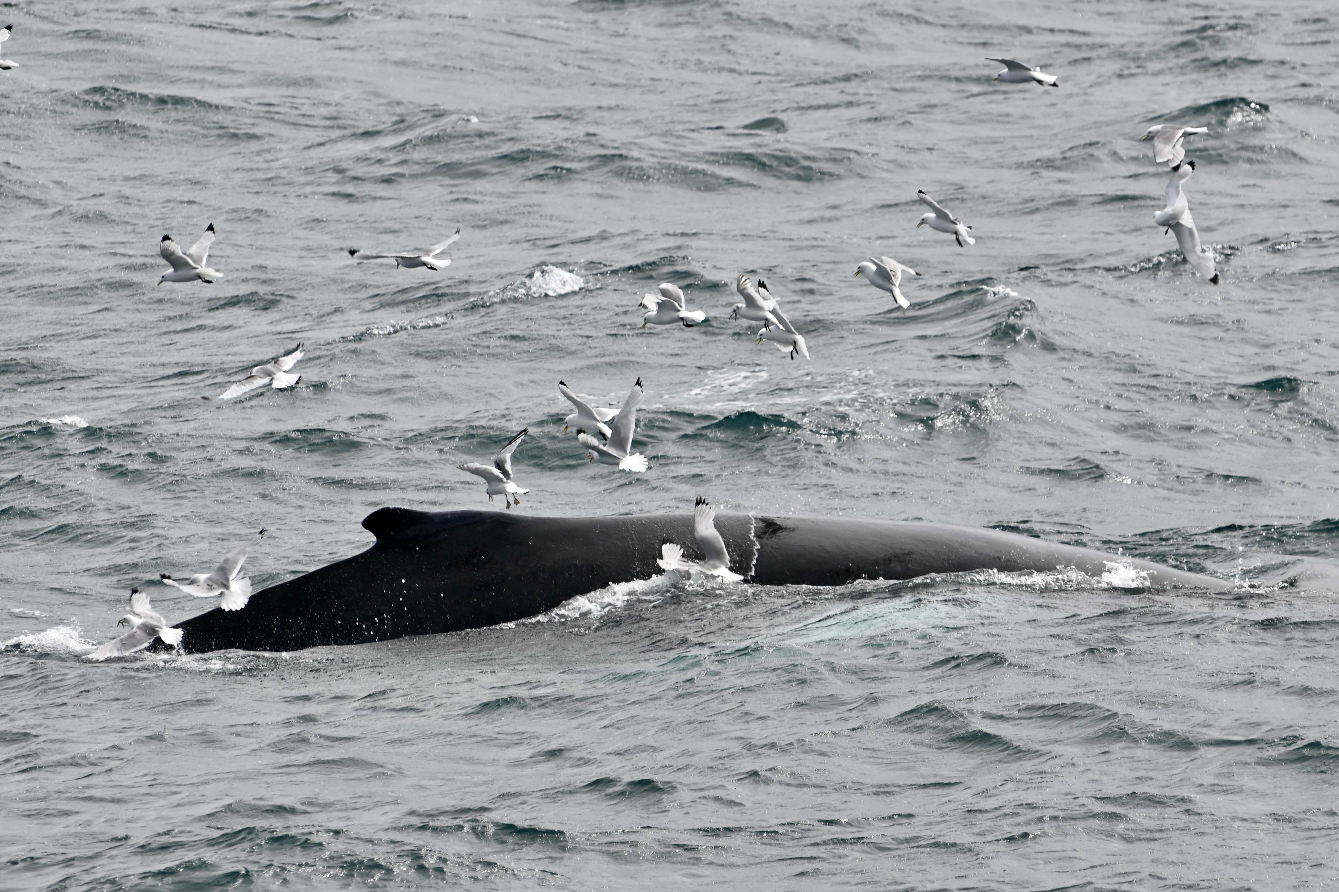 Report from Eldey: We bundled up and headed out into the sunshine! There were many flocks of birds actively feeding so we knew the food was plentiful this evening. Not too far out into the bay we spotted the blow of one humpback whale! This whale was going places, and gave us a really nice fluke dive before it was off again! So we let that humpback swim into the sun and shortly after we saw another blow! We had found another solitary humpback whale! This whale also showed us their fluke and then was off but alas we saw a third blow in the distance. When we went to investigate we realized it was five humpback whales, luck was on our side this evening!  These whales provided us with multiple surface sequences as they were feeding collaboratly and coming to the surface in unison. Then, out of the blue, a breach!  What a wonderful surprise it was.