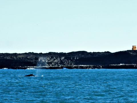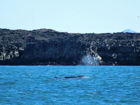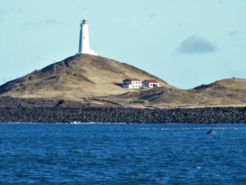 Report from Eldey: Another day in Grindavik proved us that's the place to be right now. Morning started beautiful - sunny and calm. We sailed along the coast to enjoy views for cliffs and also because last day wildlife was close to shore. It take us a while, around one hour, till we saw blow on horizon. Under huge flocks of birds we saw 4 humpback whales and another one further in the distance. Whales were feeding close to land, next to amazing rock formations and lighthouse. 3 of them were very close to the boat - one couple was always surfacing together - looks for us as mother-juvenile duet, and another big one near by. Whales were going for shallow dives, raising tails above water surface before going down. In the moment we decided to sail back, one of them slapped the tail twice, hitting the water surface with massive splash. Nice way to say goodbye!
