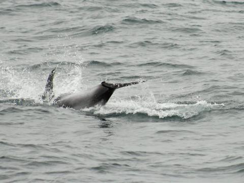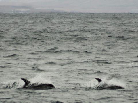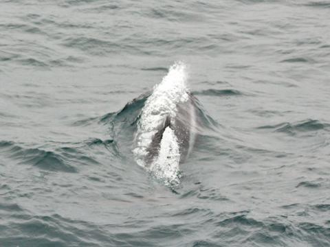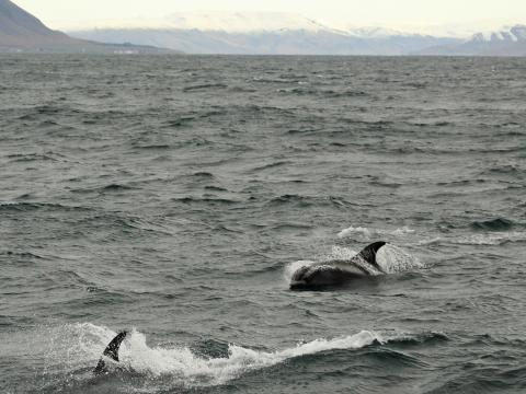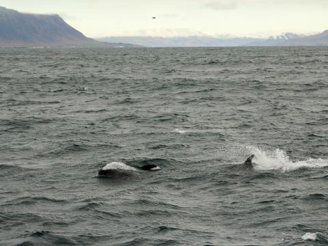 Report from Eldey: Poseidon has calmed down from yesterday and we were all set for some fine nature experiences. The cold "breeze" and some movement reminded us that we are in the far North after all, but that didn't stop us from seeking adventure. After proximately an hour of sailing we ran into a pod of maybe 6-9 white-beaked dolphins. These creatures being unpredictable around our boats, we were not sure what to expect. But soon enough we realized that they are feeling playful and sociable. They checked us out by coming close to the boat, bow-riding, jumping out and swimming under the vessel. It was a true delight to be surrounded by them. Together with the dolphins there were dozens of hungry northern gannets flying all around. In all that commotion I could spot a young minke whale, but only for two short glimpses. We tried to look for it later, but it was too fast and too well hidden this time. All in all a beautiful tour with lots of action around us. As it always is, all good things must come to an end, so we turned back to the harbour and were contempt with what we've experienced.