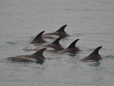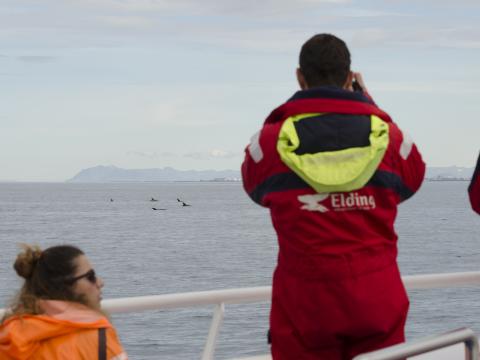 Report from Elding: As always in the last days, we went out from Reykjavik on this beautiful morning. We had been sailing for only about 20 min, when passengers spotted the first minke whale of this tour. We spent some time with this individual and with the help of our pictures of it, we could identify it as "Elephant", a minke whale that was identified first in 2013 and was also seen in 2014. We left it alone after a while and headed further offshore. It didn't take long until we found two pods of white-beaked dolphins. The larger pod (about 15 animals) was feeding underneath a lot of circling seabirds, while the second group didn't not move around that much. We could spent quite a while with these dolphins, and watched them stop feeding and traveling next to us and finally join the other pod. While watching the dolphins, we also saw three minke whales in some distance, and later decided to get a close look at these individuals. As we observed the minke whales feeding around us, we still had an amazing view of the dolphins a little further away traveling together and leaping out of the water. After spending some time with the two minke whales, we headed back to the dolphins and could observe them resting closely together and barely moving. Even on our way back to the harbour, we stopped another two times, because minke whales kept surfacing around us. A busy tour full of cetaceans!