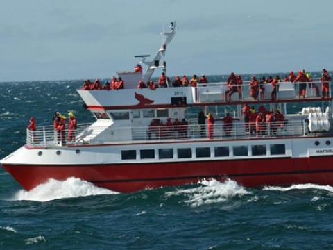 Tour at 14:00Report from Elding: we went the same route towards Akranes as this morning but then turned out into the bay. We searched amidst the white tops until captain Hermann spotted a blow from a minke whale. We saw this individual two or three times before losing it. A few minutes later we saw another one and managed to see it a few times but we are not sure whether it was the same individual or not. Once it was gone (too, if it was different individuals) we were stationary until some passengers as well as our researcher Céline spotted a few white-beaked dolphins. This was a pod of perhaps 3-5 and we got some close approaches but then they too vanished. Another similarily small pod appeared enroute back home but only for a few minutes. Unfortunately this tour did not present us with as good sightings as this morning but we still managed fine given the conditions.- Baldur Thorvaldsson