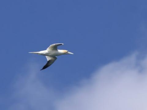 Report from Hafsúlan: The weather and sea condition situation was almost the same on this tour like on the 9 o'clock trip except that most of the clouds disappeared. Being successful on the first tour we took the same course again and while talking about that we were searching for birds, we discovered a huge flock of black-backed gulls together with some fulmars close by shore. No cetacean were around them so we continued out towards the place of the feeding whales from before and not to far away from there we found more and more gannets. As they started diving down like torpedo a blow appeared between them. It was quite difficult to look at the right time at the right spot but twice this minke whale showed even its white pectoral flipper and its arched back and several times just the dorsal fin. Once we smelled the "stinky-minke" as the wind blew its breath in our direction.