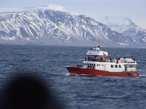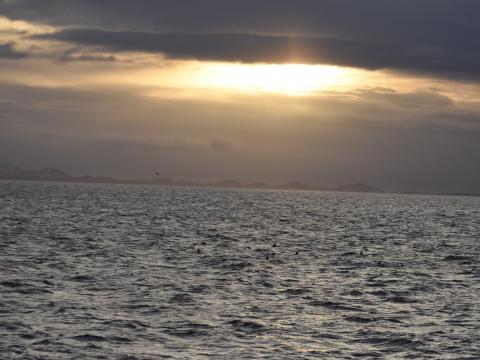 Report from Eldey and Elding: The weekend and calm weather conditions brought everyone out and about today. So many lovely passengers flooded to our door to do a whale watching tour that we had to take out two of our big vessels. Eldey has a max. capasity of 200 people and Elding 144. There was a stunning scenery with the snow capped mountains and sunrising/setting and calm wind on the way out, however on the way back it was very cold as then we headed into the wind, our passengers then made use of the warm inside saloons. Eldey got a quick glimpse of a harbour porpoise and got word from Elding that they spotted 3-4 white-beaked dolphins. We headed that way but were unfortunetly unsuccessful in spotting them ourselves. This happened twice but the dolphins were difficult to follow and obviously was not in the mood. Both boats gave our complimentary tickets to our passengers in the hope they will see more next time the come. Eldey saw also one pod of 4-5 harbour porpoises but they too were a little elusive. It was quite strange that we didn´t see more however as the birdlife was both abundant and diverse. Many flocks out in the bay. A birders paradise.