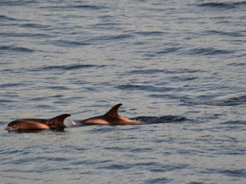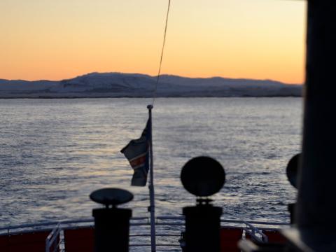 Report from Eldey: What a stunning Icelandic morning! The swell was long and smooth today ensuring a relaxed ride under a beautiful blue sky. With a hot coffee in our hands we welcomed the new day watching the sunrise behind the skyline of Reykjavik. The bay of Faxafloi still seemed to be asleep. We sailed for quite a while without seeing a glimpse of any wildlife - just the peaceful dark blue water. But suddenly the scenery changed: A pod of 6 white-beaked dolphins. Among them: two calves. One of them much smaller than the other!! What a great encounter. The dolphins surfaced a couple of times close to our boat and did not seemed to be bothered by us at all. According to our fish finder and the many birds in the area, the pod was most likely feeding and very focused on their prey. We enjoyed watching this pod for a while before we started heading back home to the old harbour of Reykjavik. this tour was definitely a great start into this wonderful winter day.