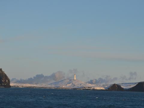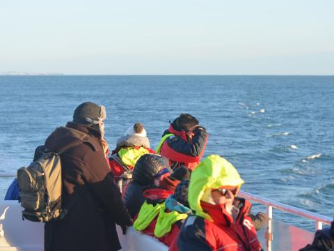 Report from Hafsúla: We decided to sail out from Grindavík today and go from there along the Reykjanes peninsula to Sandgerði. We passed Eldey, a small island with sheer cliffs that rises to the height of 77 meters. We then sailed along the west part of the peninsula and there we did not get as good shelter from the northern winds so our journey got rockier and felt a bit colder. On the way we saw some of the most beautiful coastlines of Reykjanes, high cliffs that are home to many sea birds in the summer. It was quite amazing to see the big waves hit these high cliffs with so much power that the splashes went over them. The strong currents that go through this area bring a lot of nutrients so often we find this area to be quite lively. Unfortunately it didn't seem to be so lively today except for few sea birds that flew around us. We were not able to find any signs of cetaceans on the tour and for that reason we offered our passengers complimentary tickets so they can have another chance with us to see these animals.