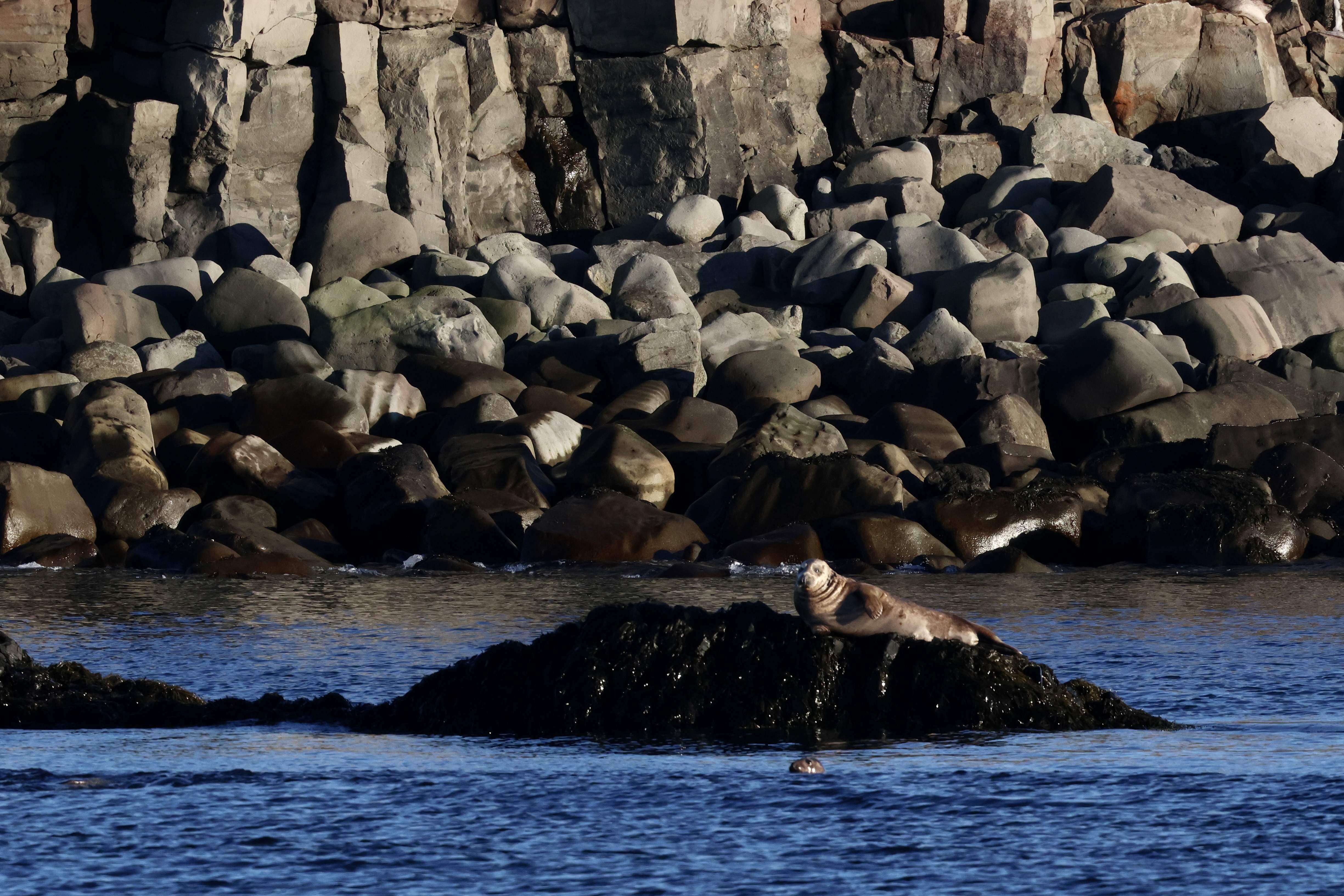 Report from Eldey: Out we went to find the whaly whales. It was still pretty windy during the afternoon, but still no snow or rain in sight. We started by checking around the Reykjavík islands, Engey, Videy and Lundey. On this last one, we got the suspicion of a weird white cap that turned out to be a blow! It came from 1 humpback whale, Banana! She/he was feeding, and it was very busy going back and forth. Every time it went down, it showed us the fluke, very politely, always. We soon saw another blow about 1km away, from another humpback. As we came close to it, we realized it was Split! They are normally together, but this afternoon they decided to go their separate ways. While we watched this last one, we stopped doing that when they came together again. Before we went back, we saw about 10 grey seals chilling on the rocks of Videy.