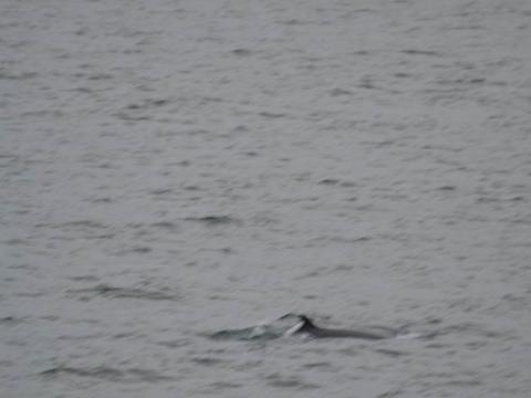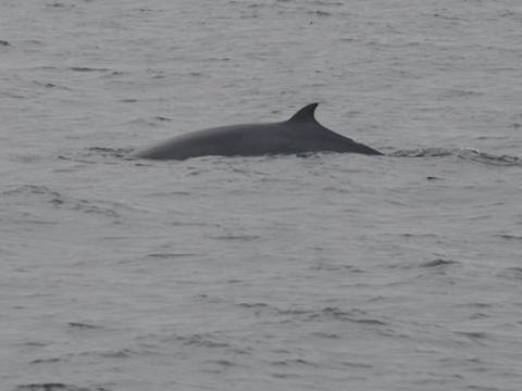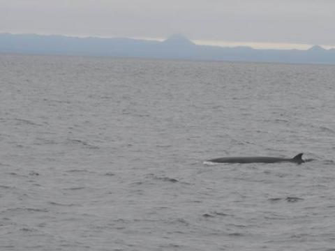 Report from Hafsúlan: Today there was very little wind and the swell came down compared to yesterday. The sky was still overcast but we were most of the time in a dry area while some parts of the landscape disappeard in the rain or clouds. In these circumstances we had quite good conditions to spot signs even further away so we managed to find througout the trip at least 7 Minke Whales. The first 2 we met in one area relativley close to each others and the one nearby had a dent at his back in between the dorsal fin and the tail. It seems like this whale has not been named yet eventhough it is not the first time we came across it. As an other whalewatching vessel arrived in the observation zone we continued our search for others. So we found more as we stopped several times. Some of these minke whales came quite close and in the quietness around us we could hear the forceful exhalation of a closeby minke very well. One rushed to the surface producing a lot of white water. We were able to see the upperesides of their heads where they have their 2 blowholes and several times as well the blow which is not always as clearly visible as today. We observed a lot of backs and dorsal fins some of them arching highly before descending diagonally for a dive. In the distance far away at the horizon we spotted several splashes which were probably made by breaching dolphins so we tried to get closer to them but as we were running out of time we had to sail back where we found some more minkes as we passed beside them. Everybody had very good chances to see and hear these numerous minke whales.