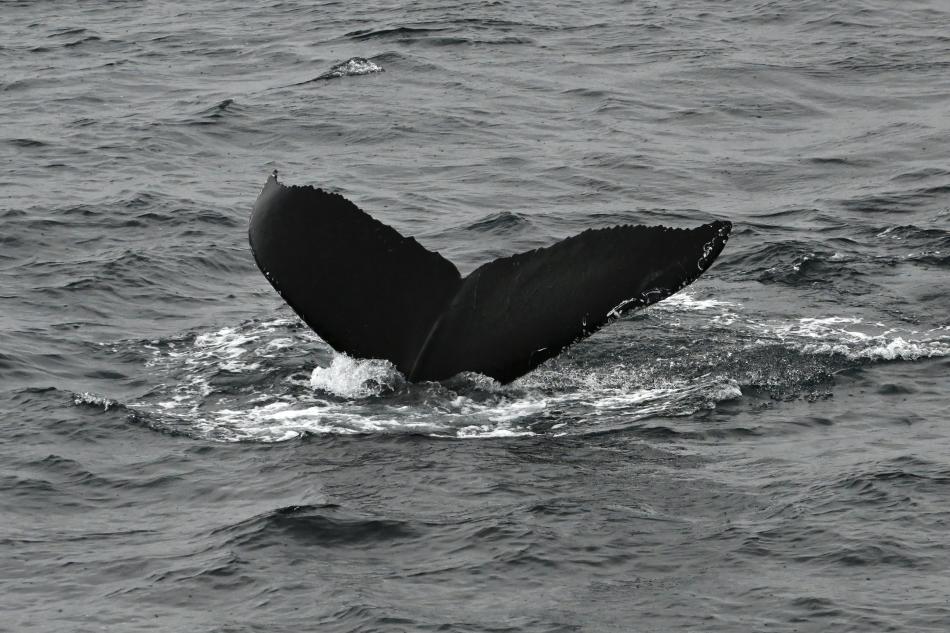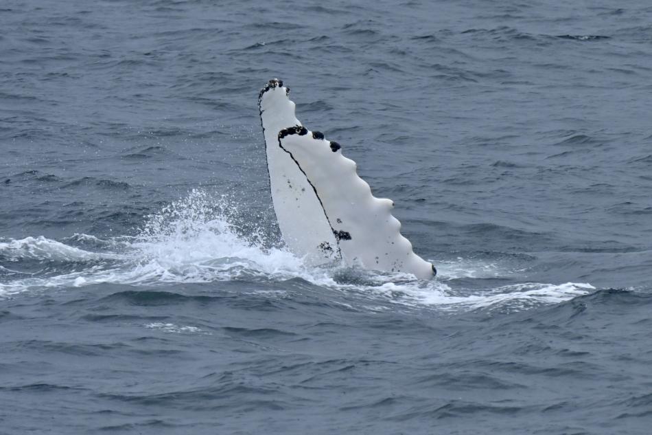 Report from Hafsulan: We embarked in drizzling rain and cold winds, heading out into the bay hoping to see that whales that have been feasting here the past week. Not long after, we spotted a blow in the distance, the first humpback whale sighting of the tour, or so we thought! It was actually a pair of humpbacks! They were calmly hanging out just below the surface, occasionally preforming synchronized fluke dives, and a sudden tail-slap. We then moved on, headed for one of the several blows we could see on the horizon, and were treated to quite a show! The humpback we were headed towards started breaching, head-slapping, pec-slapping, showing of almost all of their acrobatic behaviours. It finished off the show with a grand finale of pooping near the surface, showing our guests the whale pump in action. Satisfied with the show we were treated to, we headed back towards the harbour, spotting a minke whale briefly on the way back.