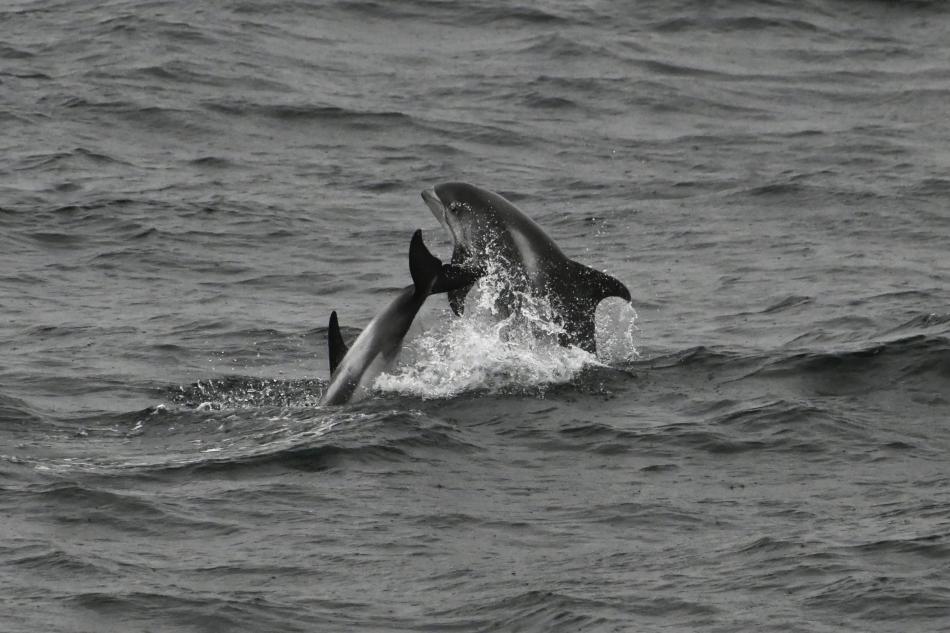 Report from Eldey: Coming out again this afternoon, the rain became the only bother of our tour. Quite quickly, we spotted several blows not far into the bay. We managed to stay along 2 consecutive humpback whales, both coming up and down, fluke diving for all to enjoy. One was at first logging peacefully, before breaching out straight in front of the whole crowd ! As we left these whales, we headed towards 2 pods of 7 white beaked dolphins, multiple mother-calf couples, several jumping out repeatedly, finishing our rainy tour on a high note.
