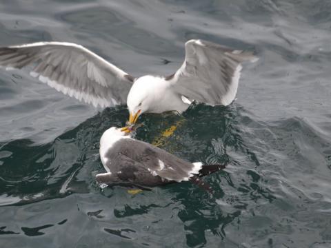 Report from Hafsulan: Conditions we fairly rough today with winds coming from south-east. On our way to our main sighting area, we saw lots of Atlantic puffins on the way which was quite nice. After about 1 hour / 1 hour and 20 minutes, we spotted two big flocks of feeding sea birds close to each other, which we sailed towards to check it out. After maybe 10 minutes of observing this flock, we had a minke whale pop up very close to the birds. This whale surfaced a few times around the flock of sea birds before we were lucky enough to see it launch feed and come out of the water head-first. We continued to stay around this area with sea birds going crazy on the sand eels in the water. The minke was spotted again a few times and once even as close as a meter from the boat, just underneath the water surface. After a while we decided to sail on and look for more different species. After the minke whale, we weren't very successful and even though we spotted a pod of two white-beaked dolphins, they disappeared right after they came up. On our way back, facing strong winds, we were lucky again to spot another pod of about 5 dolphins. We were able to get a better look at these guys, as they were swimming quite close to our boat. After watching these fairly calm animals, we decided to sail back as winds were increasing.