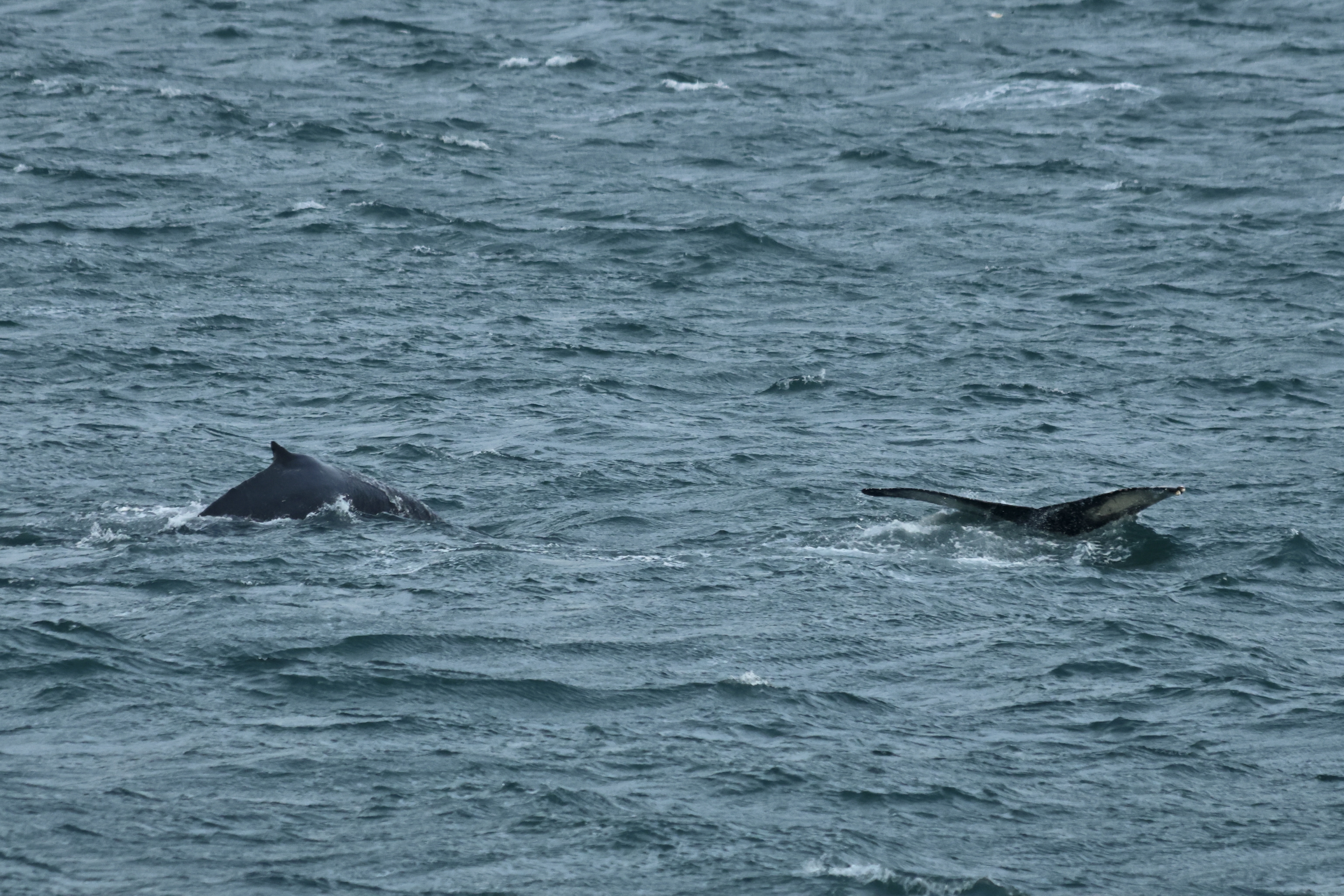Report from Eldey: We wet out in a strong wind from the east. At least it was dry and so we could enjoy the tour covered in our overalls. Just a few minutes outside of the harbor we spotted the blows of 2 humpback whales. Banana and friend were busy feeding and so we got a good look at these great animals. After we spend some time with them we went on a cruise around the islands and found 2 harbor seals. one of then curiously checking us out from close to the boat, the other one resting on the rock emerging from the falling tides. Before we returned to the harbor we had another good look at the two humpbacks.