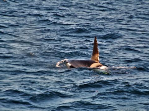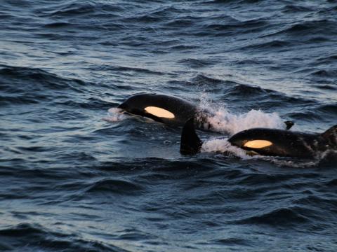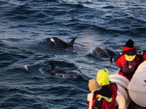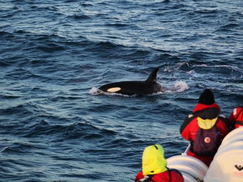 Report from Elding: Today we left again from Grindavik. Our last tour yesterday having been a great success, we set sail in high spirits! On our way out the rising sun was keeping us company, as we were exploring on a delightfully calm sea, although it was bit a cold. About one hour after departure, passengers spotted a huge blow behind us. It was a humpback whale! The whale seemed to be feeding close to the sea bed, taking frequent but not so long dives, which allowed us to follow it for a while. Then, popping up in the distance, we noticed a second large blow, another humpback whale. Left to this new whale, there was frantic movements on the sea surface. There were smaller blows, and they were numerous. Looking through the binoculars, we saw huge dorsal fins coming up. Jackpot! We found ORCAS! And a lot of them! This pod was including 15-20 individuals. What a sight! We successfully got close to them, and they seemed to take interest in our boat, circling around, and coming close at the stern of the boat. There were few impressive males and adorable calves, it was a very exciting encounter. When the time to go back arrived, the killer whales followed us for a while before returning to their own business. This is why winter whale watching can be wonderful!