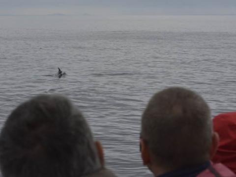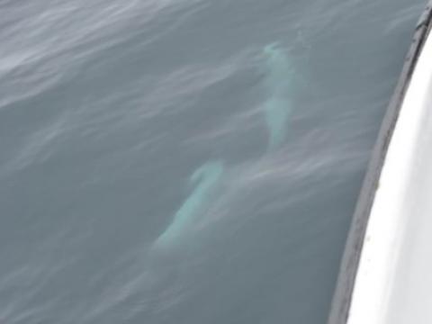 Report from Hafsulan: This afternoon the clouds slowly moved in, but it was still dry and almost no wind. Early on in the tour we spotted 2-3 Minke Whales close by the Whalefjord. The individual traveled fast and so we decided to head out further and look for more interactive animals. Soon enough we were successful in seeing 4-5 Minke Whales surfacing in close proximity of the vessel. One individual was literally shooting out from the surface of the water, piercing though the water with their telescoped head, showing off their two blowholes clearly. After this very impressive encounter we looked for other cetaceans in the bay and were successful in finding 3-4 pods of White-beaked Dolphins. One of the dolphin pods interacted with our boat quite readily. They leaped and jumped in front of the vessel. For 5 minutes they were bow-riding. Due to the crystal clear water conditions, their bodies were visible even beneath the surface, resulting in many "Ahh"s and "Oh"s from our fascinated guests. On the way back we saw another 3-4 Minke Whales and 1 more pod of 5-7 dolphins. The perfect weather and the interactive cetaceans made this trip absolutely unique.