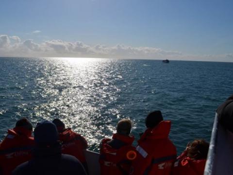 Report from Hafsúlan: The seas were calm as we left the harbour in Reykjavík this morning. It did not take us very long to find the first white beaked dolphins. After we had spent some time with them we decided to head furher. After a while, we found another smaller pod of dolphins. On the way back, a minke whale was spotted but it did not show itself very often or very long, only surfacing two times in a row before diving down for a long time. All in all it was a good tour on a beautiful day.