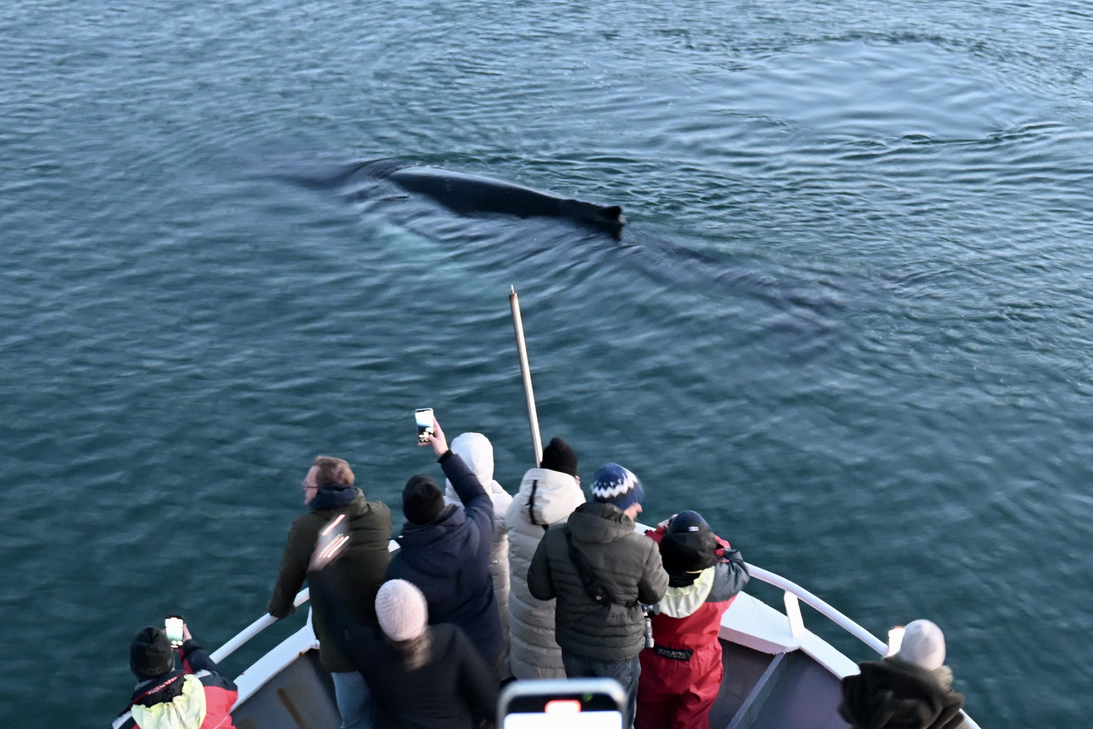 Report from Elding: With snow just starting to fall, we grabbed a hot chocolate, bundled back up and headed out, excited to see who we would see this afternoon. As we headed out, the snow started to fall a bit harder, which cast a winter wonderland across the mountains and skyline. Not too far away from port we spotted the same pair of humpback whales from this morning! Unlike their sleepy behaviour this morning, They were on a feeding mission and showed us their impressive flukes right away! After they resurfaced, they were nice and close and we could smell their fishy breath. After multiple surface sequences, one individual fluke dived, while the other started to peduncle throw their tail around! After a few throws, this humpback showed off their fluke as well. It was amazing to see their white pectoral fins through the surface of the water, and this allowed us to easily track them as they swam right next to us. With the snow bringing clouds low down around us, it was as if it was just us and the humpbacks in a snowglobe. After a magical viewing, we waved our humpbacks goodbye and went to see if anyone else had come to the bay since this morning. We admired our surroundings that now were freshly coated in snow and the admired some birdlife. We then spotted 3 harbor porpoises. They came very close to the boat, and it was great to see their little bodies through the surface. After viewing our harbor porpoises, we stopped by our humpback pair again for a few more surface sequences, and then headed back to port. What a great way to end our day on the bay.