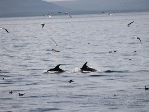Report from Eldey:   It was a beautiful day on sailing out into the bay, the sun was out and the sea was calm. It really didn't take us very long to find cetaceans today, and what a tour we were in for! We first encountered 7-8 very playful and curious harbour porpoises which surfaced many times before going for a longer dive, but this was no matter as a minke whale the surfaced to our left hand side. Coming up a few times and allowing us to see its nose popping out of the water followed by its large black back and sickle shaped dorsal fin. This animal arched its back and went for a longer dive so we headed out further into the bay to see what else we could find. Another minke whale surfaced but was being quite elusive so we moved on and found ourselves a humpback whale. This animal surfaced a few times in the distance going for fairly long dives, and as there were a fair amount of boats surrounding it, it was decided we should go check out a pod of 3-4 white-beaked dolphins that had popped up a few hundred meters in front of us. The dolphins put on a truly wonderful show for us and began leaping, inverted breaching and playing around in the water. They came up so close to the boat you could follow them right under the waters surface! Truly incredible! There was even a mother and calf popping up in the surf. After getting a really wonderful look at these animals, we decided to have another look at the humpback now there were less boats in the area. On our way out more harbour porpoises were seen leaping out of the surf! Once closer we were able to see the humpbacks mighty heart shaped blow, its black back and even the fluke, which it raised many times into the air as it went for a longer dive. What a speciestastic tour!