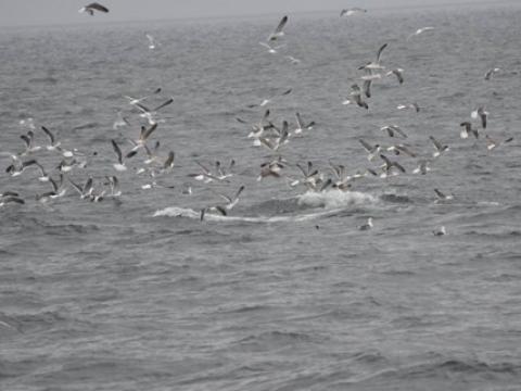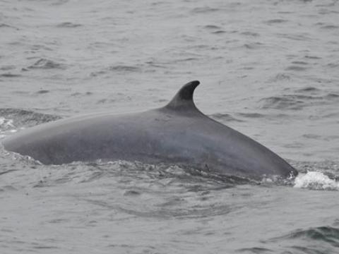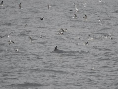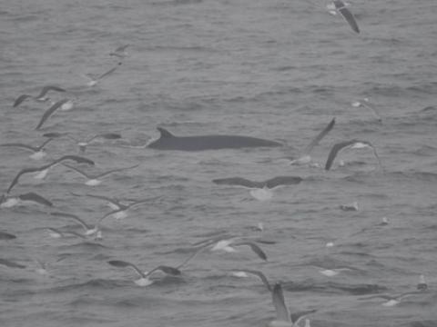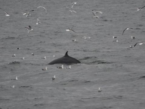 - Carine ZimmermannTour at 13:00Report from Hafsúlan: The wind had calmed down since this morning and the weather was quite nice accept from a few rain drops. We headed towards the same area as this morning and on our way we spotted a few groups of Harbour porpoises surfacing around us, some even came very close to the boat. When we got to the area we saw two big flocks of feeding birds, but unfortunately no cetacean was spotted around them. We searched for over two hours and our patience was almost running out when a Minke whale was spotted in the distance. It seemed to be heading towards the flock of birds so we watched that area very carefully. All of a sudden the minke whale surfaced in the middle of the group of birds. We could see the whale was feeding as it rolled in the surfaced so we got a good look at the white pinkish belly and the flippers. It was fun to watch the whale and we could see it blowing bubbles a couple of times which is a feeding behaviour! We could enjoy the feeding behaviours of the minke whale for some time but unfortunately our time was running out so we had to head back to the harbour. It was a very nice tour and just showed us how patient and stubborn we sometimes have to be. But we sure got rewarded for it. - Freydís Ósk
