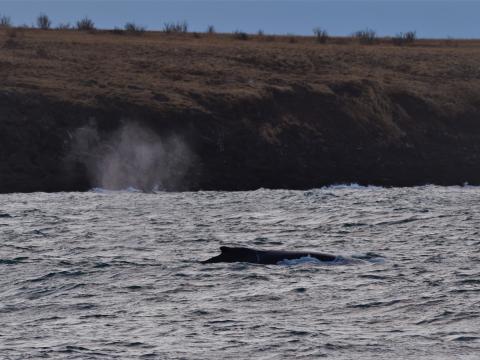 Report from Eldey: Finally, nice to see some blue sky today on our whale watching tour. The weather was good but near the end of the tour the weather turned to overcast skies, snowing and blustery winds. The sea was rough today and got rougher as the tour went on but we had some true vikings on the tour and most enjoyed the ride and very few green faces. All in all every one had a lot of fun. We had some very active, playful white-beaked dolphins, scattered pods of at least 20 individuals if not more. They played around the boat then looked to be feeding, chasing after their lunch then feeding again and so nice to see them close to land. After enjoying them we went looking for Mr/Mrs humpback whale, near to island of Lundey it was there, an area with so many birds, feeding and flying around. So much fish in close, which is perfect as the waters were rough today. We followed the humpback whale for about 30 minutes as it was heading offshore, short dives so we saw it many times. The weather was then starting to turn so a great time to head home and get a warm hot chocolate at the onboard bar.