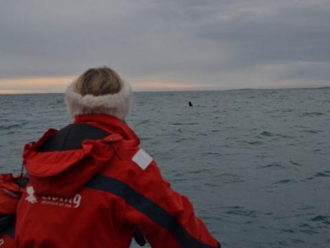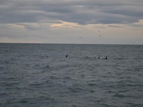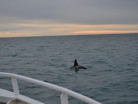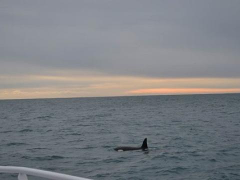 Report from Elding: Since the weather was rough today in Reykjavík we decided to go out from Grindavík instead. This decision turned out to be a good one. After only about 15 minutes of sailing we found a family of Orca (Killer Whales). There were two males, showing of their dorsal fin and then there was a tiny calf among them. Despite there being schools of hering at a depth of 30 to 55 meters, the killer whales spent most of their time swimming slowly and calmly at the surface. We managed to get very close to them so we could hear them breath and see their blow holes. Great tour on a bright, windy day.