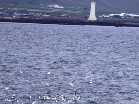 Report from Hafsúlan: The winds had calmed down and conditions were better this evening than they had been in the afternoon. We started by going north, almost up to Hvalfjörður and followed the coastline up to Akranes. We enjoyed a very good view of mount Akrafjall on our way there and spotted some flocks of birds just off the coast of Akranes. Theses flocks looked very promising and we headed towards them expectantly. Just as we had hoped a Minke whale surfaced close to one of the flocks. This individual was very elusive however and after one look at us, turned tail and swam away. We looked for it a little bit longer and the decided to head further south. We had just turned south when another minke was spotted. This one was much more sociable and surfaced quite often around us. We got a very good look at it from different angles and it even surfaced quite close to our front. By this point the weather had also calmed down even more, making the encounter that much more enjoyable. Before we headed back to land we had one more brief encounter with a minke, a nice finishing touch to a good tour.
