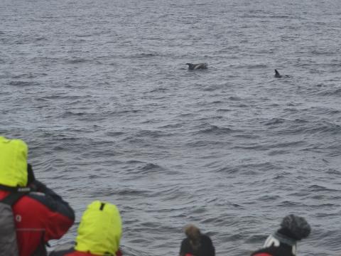 Report from Eldey: It looked pretty dreary out in the bay, with large dark rain clouds but thankfully we only got rained on lightly at the start. What a bitter wind though! We had only been going 20 minutes after our late departure when a passenger spotted our first minke whale, surfacing only 100 m from the boat. Unfortunately we could not relocate this individual after our close encounter but we didn´t need to worry as after 20 more minutes travelling we came across a second individual. This minke whale was much more predictable, keeping to the same path which meant that we could put the boat in the right place for when it resurfaced - it came up only 20 m from the boat! You could not get a better view of this often elusive species, so we continued out and found 2 pods of white-beaked dolphins. These animals were most likely feeding, often turning in circles and then surfacing quickly, and we even got a little head-slapping from one individual. A lovely two species tour in this bitter weather!