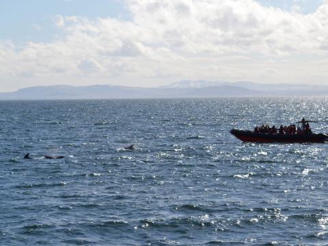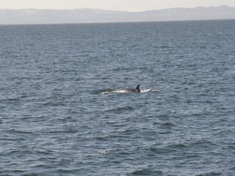 Report from Eldey: The The whole trip radiated with serene beauty. The calm sea, the play of light from the sun hiding behind the interesting clouds and the perfect visibility in all directions. Compared to the two other trips this day, we had to go pretty far out to see anything, as the sea appeared to be an empty desert - no birds whatsoever. Finally we spotted 5-6 white beaked dolphins in the sun glare. The animals were very relaxed and to our delight approached the vessel, swimming besides us, diving under the boat and giving us a great show. Soon after we saw 4-5 harbour porpoises exhibiting the same kind of behaviour as the dolphins, which is not such a common sight. Too top it off we had a couple of nice encounters with a beautiful minke whale that was feeding in the area close by together with the other odontocetes and various bird species above. As we sailed back, on our way we saw dolphins jumping out of the water.