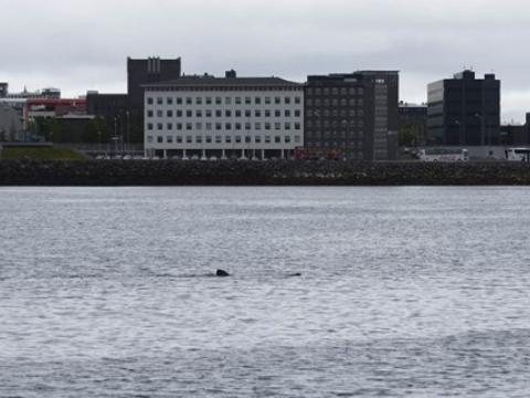 Report from Hafsúlan: Once again the clouds rolled in and covered most of the landscape that we love to see, it was quite amusing that the only blue sky we had was a small patch over Reykjavík, which result in a couple of nice pictures. We sailed offshore and it took us a bit long to find the whales this evening. It was actually a call we got from another whale watching boat that alerted us of a whale. We headed over and watching this one Minke Whale for over 20 minutes, it surfaced close a couple of times but it was really nice to watch surface slowly, completely at easy with our presence. We left this whale after a time and found another minke whale surfacing close to a big flock of resting puffins and other auks, this one only surfaced a few times before diving down and not surfacing again in our vicinity. A small pod of 2-3 Harbour Porpoises was also encountered and a nice sail home through the calm waters.