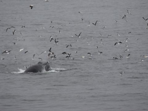 Report from Eldey: Last tour of the day for Elding and the passengers that decided to take the ride in the evening, and what a ride! It was cloudy when we left the harbour, the more we were going in the Faxaflói, the more foggy the atmosphere was. The sea state kept calm during the whole tour which gave us the chance to see some harbour porpoises on the way out. We could see them for a couple of minutes. We where heading the same spot where the humpback was in the previous tour and it was a great decision because after one hour of the tour we just fully enjoyed of an amazing humpback whale in the feeding time. It showed an incredible feeding behaviours going at the surface with the open mouth several times. The animal got very close to the boat giving us the chance to take a better look from closer. We also had a great show of hundreds of birds feeding around in the area, diving next to the humpback whale. Such an amazing way to spend the evening, pure wildlife around.