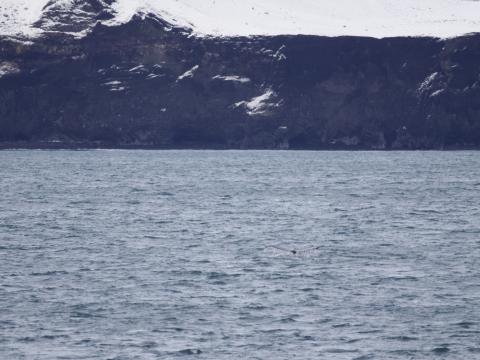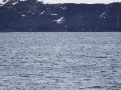 Report from Eldey: We sailed out from Grindavík today so we first had to drive for about 50 minutes to get to there. This was a beautiful winter day. It was really cold but not so windy and quite strong underswell rocked our boat up and down but luckily for us we never had to go far from land. We spotted a humpback whale quite close to land. It was very elusive, spent long time underwater and traveled long distances along Reykjanes peninsula between surfacing. The humpback whale slowed down very close to Grindavík and that is where we got the best look at the whale. When our time was running out and we had to head back we only had to sail for 10 minuets to get to harbor. It stayed so close to land that it might even have been as easy to watch it from land.