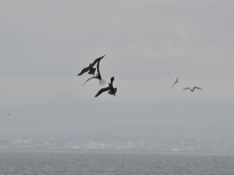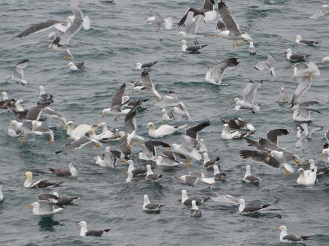Report from Hafsúlan: Cloudy sky and light rain put the complimentary overalls to good use during this afternoon tour. We set sail west, out in Faxaflói. After nearly one hour of sailing we came across a huge flock of seabirds. Mainly lesser black-backed gulls were feeding by the thousands close to the surface. We got a short glimpse of a pod of 6-7 white-beaked dolphins, while we passed by. We had spotted a big blow in the distance and we wanted to investigate that. Truly it was a humpback whale, it was slowly moving close to the surface with occasionally deeper dives showing the fluke really nicely. On our way back we stopped by the big flock of birds and got good looks of 2 minke whales feeding in the area. Really nice end to this tour with all the seabirds showing a nice feeding frenzy!