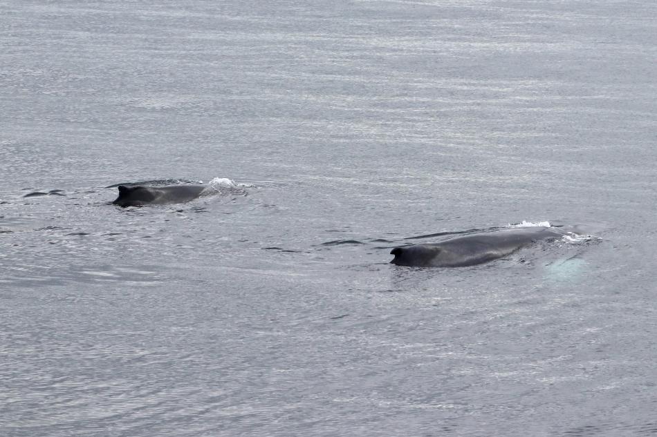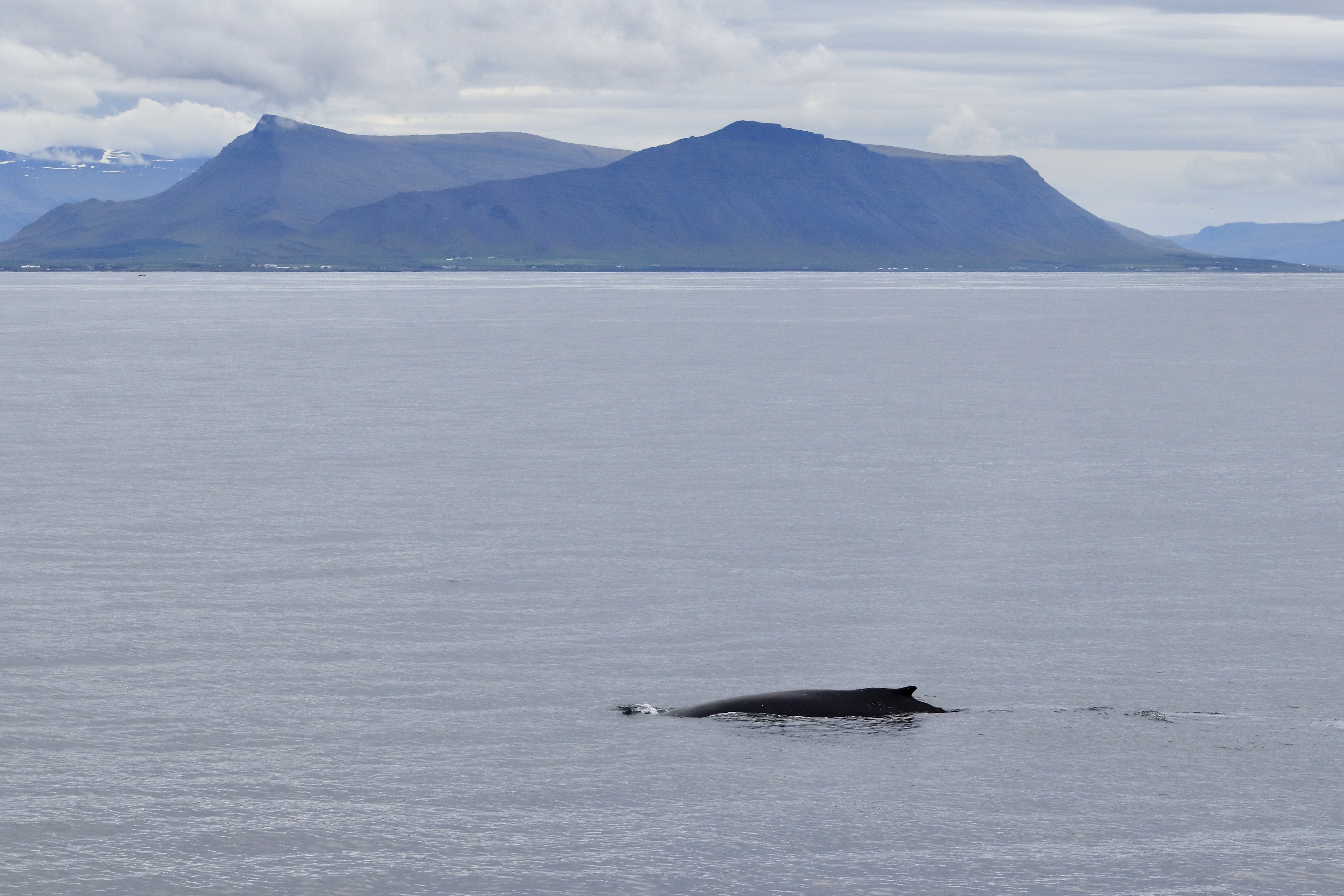 Report from Hafsulan: We left port in perfect whale-spotting conditions, flat waters, thin cloud cover and minimal wind. Near the harbour, we caught a brief glimpse of 3 harbour porpoises, moving swiftly towards the coast. As we continued out into the bay, it didn't take us long to come across a pair of humpback whales relaxing near the surface. They were going for shallower dives, occasionally fluke diving as well, until they began logging on the surface, allowing us to get a good look, as well as a good listen to their blows! A very relaxed, magical encounter. We let these two continue with their nap, and moved on to another blow in the distance. It was another humpback whale, a bit more active, going for regular longer, deeper dives, giving us a good look at its fluke each time. It also pooped near the surface between deep dives, not once, but twice! We then spotted a minke whale and moved closer to investigate. We managed to see a couple of surfaces, but quickly turned out attention to larger dorsal fins in the distance, a pair of white-beaked dolphins. We managed to catch a few surfaces, but were again distracted by the numerous blows on the horizon. So we decided to head to yet another humpback whale, spent a lovely couple minutes admiring it before we had to head back towards the harbour. On the way back, we kept out eyes on the many blows surrounding us in all directions. One humpback even did a quick spyhop in the distance. What a lucky tour!