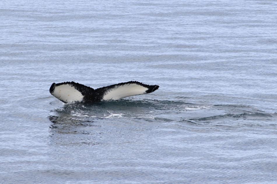 Report from Eldey: The weather this evening was very good for whale watching. Even though it wasn't sunny, it wasn't raining, there was no wind, and the ocean was quite flat. We sailed out and we first encountered 2 minke whales. However, they were not very friendly and we decided to leave and look for something bigger. We found then our first humpback whale of the evening. It was very focused on feeding, but every time it went down, it gave us very beautiful fluke dives. Then, we went to check another blow on the distance and it was another humpback. This one was more relaxed and we could stay closer to it. But then, it decided to have dinner as well and we saw some lunge feeding. At the end of the tour another humpback appeared, and a very large pod of white beaked dolphins. We didn't know where to look. Finally, we had to leave but on the way back some of the dolphins followed us to say goodbye.