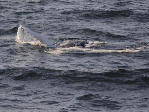 Report from Eldey: The sun was still shining bright and the water was very smooth when we sailed out from Reykjavik. Quite soon we spotted about 5 harbour porpoises very close to the boat but after they surfaced a few times we did not see them anymore. We were informed by the captain that there was a minke whale close to us and we saw it surfacing a few times. While looking at the minke whale we spotted a blow and some splashes in the distance, it was a humpback whale ! When we reached it we could see it was displaying fascinating surface feeding behavior, lunging and rolling on the sea surface. It came very close to the boat and it is possible that the animal was using the boat to trap the fish while feeding. Because this whale was so close we could clearly see its whole body underwater. When this individual went for a deep dive, we decided to check out another blow we saw in a distance and found a second humpback whale. This one was more elusive but we managed to have satisfying looks. Unfortunately it was due time soon enough and we had to travel back to Reykjavik and leave this humpback.