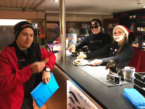 We are sailing out from the Old Harbour in Reykjavik today. There could be some movement on the boat out on Faxabay but we do offer seasickness tablets free of charge at the ticket office if you are sensitive to motion sickness. All our boats have inside and outside areas and to make the tour even more comfortable we provide warm overalls.