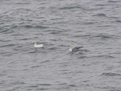 Report from Hafsúlan: The rain hadn't stopped yet but at least the sea looked blue and calmer. On our way out we found a juvenile northern gannet together with an adult. Soon the first dorsal fin of two dispersed groups of White Beaked Dolphins broke through the surface. We had a really good look at these dolphins while swimming close by, visible under water or by breaching in the distance. Joe and Double Cheese Bite could be recognised by our researcher on board. Later we spent some time with one Minke Whale which even surfaced once showing his entire head where you could see its light coloured chin. In between we had several good looks at some Harbour Porpoises surfing alongside the boat.