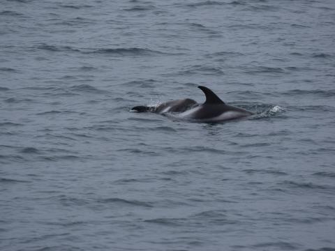 Report from Eldey: It was still rainy when we sailed out again but the sea conditions were still pretty nice. Even though it was quite foggy at first, it cleared up soon and so we were able to spot a group of about 7-8 white-beaked dolphins. We slowly approached them and soon head them right in front us. They came closer to us, played around the bow of the boat and swam underneath and all around us. I was happy to see also probably 3 juvenile animals in this group, however, one of them has a deformed back. Despite this spinal injury it seems to be okay. We have seen this individual several times over the last weeks, always accompanied by other dolphins and it seems to be in good shape! The dolphins stayed pretty close together and spent a good time around us and some of them leaping in front of us now and again. It was hard to leave them, but at some point we decided to look for something bigger and soon found a minke whale near another whale watching boat. It took a while to find it but then it was not to difficult to follow. Even though it only came up 2 times inbetween dives, it was quite easy to spot it again since its dives were rather short. We followed it for a while until we didn´t see it for an unusual long time and moved on and soon found another minke whale which may actually have been the same individual since it was not far away. Due to the good sea conditions we were able to see another minke whale a few times in the distance and also got a short glimpse at another minke whale before we headed back to Reykjavík! Inbetween the minke whale enocountere, we also got to see a single harbour porpoise that suddenly appeared in front of us.