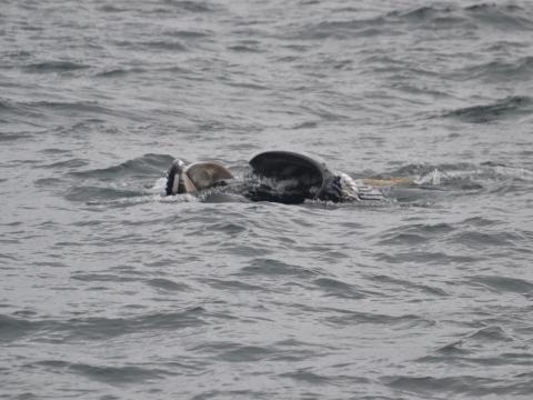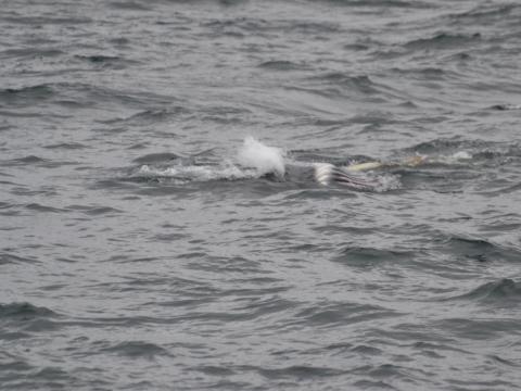Report from Eldey: This morning we sailed out under a cloudy sky eager to see some cetaceans. There was a little wind but luckily it was not raining, there was only little movement and the visibility out on the ocean was quite good. Soon we were surprised by 3-5 harbour porpoises. Suddenly they had appeared very close to the boat and offered us some nice views of them. We then continued towards the direction where we had seen incredible feeding behaviors of a humpback whale the day before and were not disappointed. After travelling out a bit further, we spotted a blow and when we arrive we saw the same humpback whale lunge feeding. What an unforgettable experience! The humpback came really close to the boat and showed us not only its gorgeous fluke and flippers, but also its baleen plates while opening its jaw to feed. Everyone could observe really well, how much water these animals can gulp and amazing pictures for everyone were almost guaranteed. We stayed with the animal for as long as possible to observe these unbelievable behaviors. Then it was time for us to head back to the old harbour of Reykjavik, happy and still stunned by such an amazing trip.