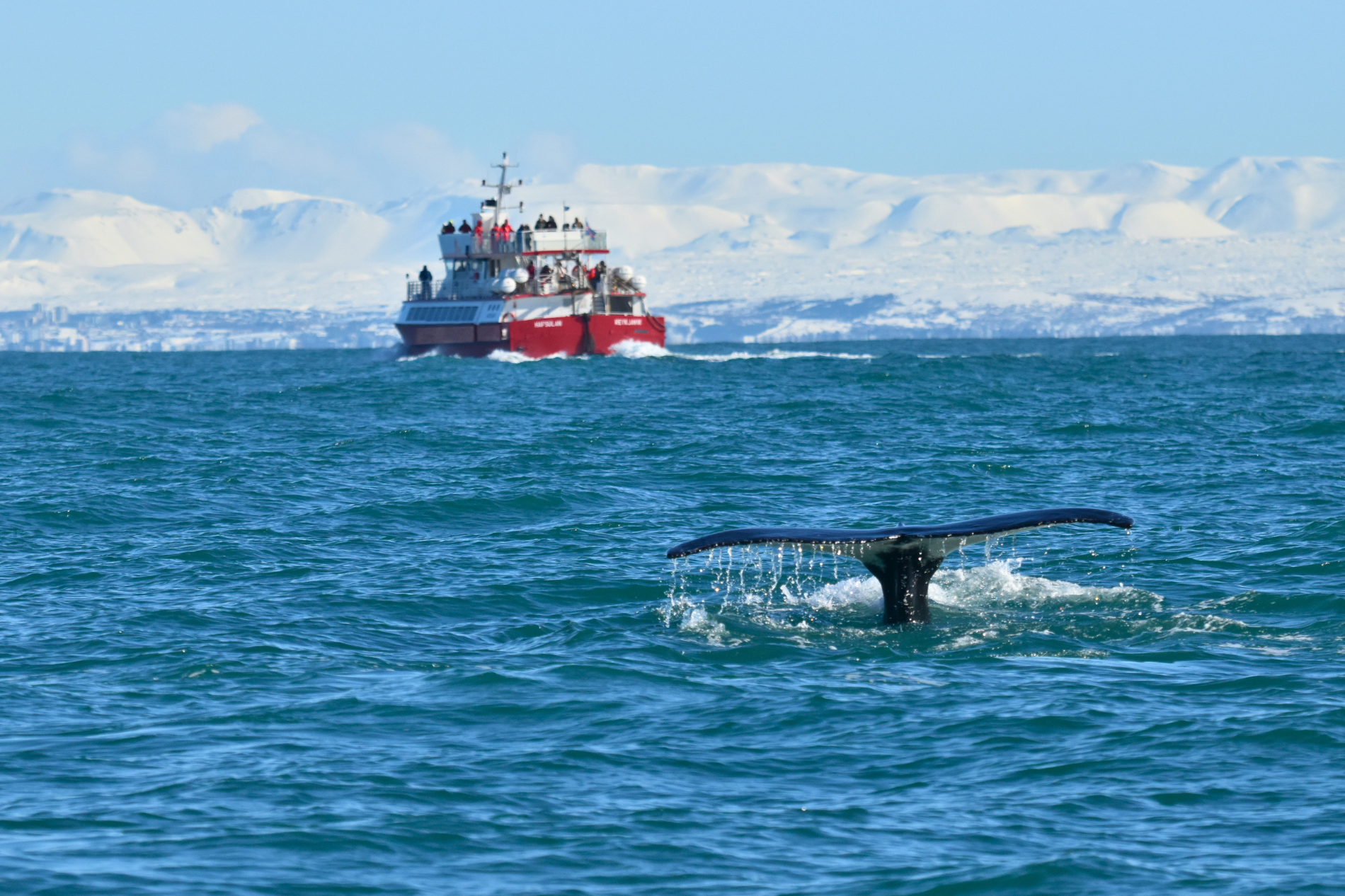 Report from Eldey & Hafsulan: The weather was beautiful this afternoon with a gentle breeze, moderate long waves and a sun heating our face. We first encountered a massive pod of 50+ white-beaked dolphins. They were swimming all around us, often coming to check us out very closely! To top it off we even saw a mother with a little calf alongside! Eventually, the dolphins all together to move onwards and as they stormed off we sailed onwards aswell. As we went further the waves grew but it was well worth it because we found a pair of humpback whales! They were going on short dives, showing off their flukes and so we enjoyed this show until it was high time for us to conclude our tour.