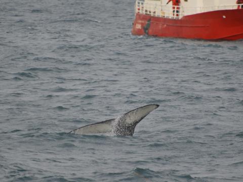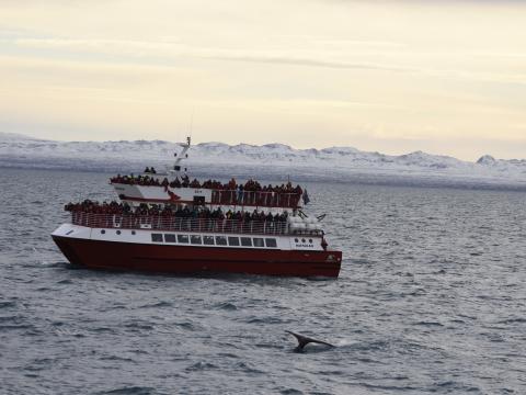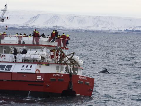 Report from Hafsúlan and Elding: It was an amazing day out at sea this afternoon, the sea was calm and the visibility great. You could see all the 120km to Snæfellsnes peninsula. The snowy scenery was also stunning and even if there was no wildlife the tour would have been an adventure. As Elding left the harbour we saw a gyr falcon swoop past and fly over Harpa concert hall. That in it´s self was incredible as these birds are mainlyonly seen around the city in the winter time. There were four whale watching vessels out on the bay today, two from our company and two from other companies. We could then search a huge area and keep in contact with each other if someone see´s something. Elding was the first to spot the blow about 800 meters towards Reykjanes after about 40 minutes of sailing. A humpback whale and what a great humpback whale it was. It was traveling at first but then started to feed, lunging and rolling at the surface. It also fluked many times for everyone to get that tail shot with the snow-capped mountains in the background. After about 45 minutes we left the whale in peace and searched more of the bay. The birdlife was also great and passed many flock of feeding birds. A perfect day to be out on the water.